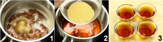 Um das Haselnussmousse und Herz mit 5 Hopfen vorzubereiten, beginnen Sie mit der Zubereitung des Biergelee-Herzens: Weichen Sie die Gelatineblätter 10 Minuten lang in kaltem Wasser ein, währenddessen bringen Sie das Bier Bock Rossa mit 5 Hopfen der Brauerei Birrificio Angelo Poretti in einem kleinen Topf zum Kochen und reduzieren es um ein Drittel 1. Fügen Sie dann den braunen Zucker 2 und die gut ausgedrückten Gelatineblätter hinzu und lassen Sie sie schmelzen. Gießen Sie die so entstandene Mischung in kleine Behälter von etwa 3 cm Durchmesser 3 (alternativ können Sie Eiswürfelformen verwenden) und lassen Sie sie im Kühlschrank mindestens 2 Stunden fest werden.