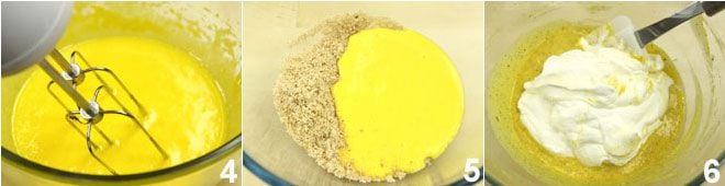 Bereiten Sie nun die Crème anglaise vor: Bringen Sie in einem Topf die Milch mit der Vanilleschote zum Kochen, fügen Sie sie den mit Zucker aufgeschlagenen Eigelben hinzu 4, mischen Sie gut und lassen Sie sie im Wasserbad kochen, bis die Crème 82 Grad erreicht. Dann filtern Sie die Crème, um eventuelle Klumpen zu entfernen, und wenn sie lauwarm ist, fügen Sie die Haselnüsse hinzu, die Sie mit einem Teelöffel Zucker zu einem feinen Pulver gemahlen haben 5. Lassen Sie die zuvor in kaltem Wasser eingeweichte und ausgedrückte Gelatine darin schmelzen und fügen Sie die steif geschlagene Sahne vorsichtig hinzu, um sie nicht zusammenfallen zu lassen 6.