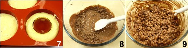Gießen Sie die Mischung dann in halbkugelförmige Formen von etwa 6 cm Durchmesser und füllen Sie sie bis zur Hälfte. Legen Sie dann das gefestigte Gelee hinein 7 und bedecken Sie es mit weiterem Mousse, bis die Formen gefüllt sind. Lassen Sie es im Kühlschrank weitere 4 Stunden ruhen. Schmelzen Sie in der Mikrowelle ¾ der Milchschokoladentafel und fügen Sie den restlichen fein gehackten Teil hinzu, rühren Sie, bis er schmilzt 8; dann fügen Sie den Puffreis hinzu und mischen alles 9.