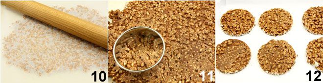 Verteilen Sie die Mischung mit einem Löffel zwischen zwei Bögen Backpapier, streichen Sie sie gut und glätten Sie sie mit Hilfe eines Nudelholzes 10 und lassen Sie sie im Kühlschrank etwa eine halbe Stunde fest werden; dann stechen Sie mit einem runden Ausstecher Kreise aus, die die gleiche Größe wie das Mousse haben 11, so erhalten Sie Kreise aus Schokolade und Puffreis, die das Mousse garnieren werden 12. An diesem Punkt können Sie das Haselnussmousse und Herz mit 5 Hopfen zusammenstellen, indem Sie den Kreis aus Schokolade und Puffreis in die Mitte des Tellers legen, dann das Mousse darauf stürzen und mit gemischten Beeren und Haselnusskrokant dekorieren!