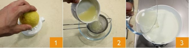 Um Ricotta zuzubereiten, können Sie in einem kleinen Topf die Milch erhitzen, sie sollte 90° erreichen. In der Zwischenzeit den Saft einer halben Zitrone 1 auspressen und filtern 2. Sobald die Milch 90° erreicht hat, vom Herd nehmen und den Saft in den Topf geben 3.