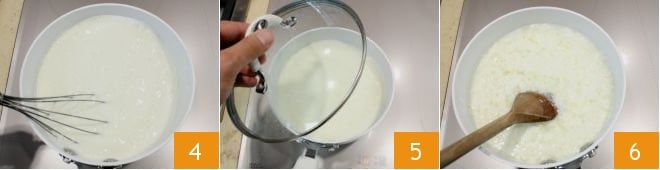 Mischen Sie einige Sekunden mit einem Schneebesen 4 und decken Sie dann mit einem Deckel ab 5. Nach 10 Minuten brechen Sie den Käsebruch, der sich gebildet hat, mit einem Holzlöffel 6 oder mit dem Schneebesen.