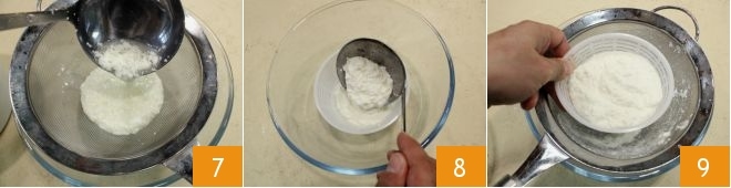 Warten Sie einige Minuten, dann beginnen Sie, eine Kelle Käsebruch in ein Sieb über einer Schüssel zu geben 7, um die Molke aufzufangen. Lassen Sie den Käsebruch einige Sekunden abtropfen und übertragen Sie ihn in eine Ricotta-Form 8. Verfahren Sie so weiter, bis der gesamte Käsebruch aufgebraucht ist. Sobald die Form vollständig gefüllt ist, lassen Sie die Form über dem Sieb abtropfen 9, decken Sie sie mit einem Tuch ab und stellen Sie sie für etwa 3 Stunden in den Kühlschrank. Ihre Ricotta ist fertig, sobald sie in der Form zu festigen beginnt.