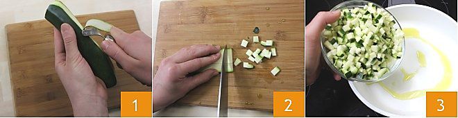 Um die herzhaften Muffins mit Ricotta und Zucchini zuzubereiten, waschen und trocknen Sie die Zucchini gut ab, entfernen Sie die Enden und schneiden Sie mit einem Sparschäler 12 dünne Scheiben ab, die Sie zur Garnierung beiseitelegen 1. Schneiden Sie die restlichen Zucchini in sehr kleine Würfel 2 und lassen Sie sie bei niedriger Hitze in einer Antihaftpfanne mit etwas nativem Olivenöl extra garen 3.