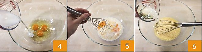 In der Zwischenzeit bereiten Sie den Muffinteig vor: In einer Schüssel die Eier und die Milch mit einem Schneebesen verquirlen (4-5), das Pflanzenöl in einem dünnen Strahl hinzufügen und weiter schlagen, bis eine homogene Masse entsteht 6.