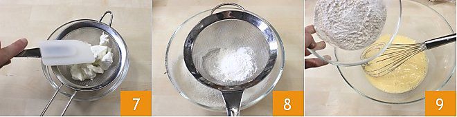 Die Ricotta 7 und das Mehl 00, zu dem Sie das Backpulver hinzugefügt haben, sorgfältig sieben 8 und dann zur Mischung geben und gut umrühren, um alle Zutaten zu vermischen 9.