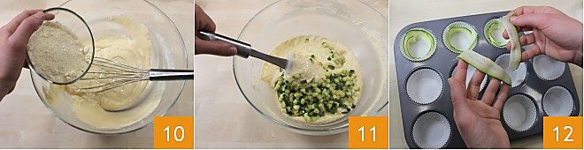 Fügen Sie jetzt den geriebenen Grana Padano 10 hinzu und würzen Sie mit Salz und Pfeffer. Wenn die Zucchini gar sind, geben Sie sie zum Teig und vermischen Sie alles gut mit einem Spatel 11. Dann geben Sie die erhaltene Masse in einen Spritzbeutel und legen Sie in ein Muffinblech 12 Papierförmchen. Schneiden Sie längs die 12 Zucchinischeiben, die Sie beiseitegelegt hatten, in zwei und kleiden Sie die Ränder der Förmchen mit jeweils zwei Hälften für jeden Muffin aus 12.