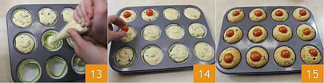 Füllen Sie die Förmchen bis zum Rand mit dem Teig 13 und garnieren Sie jeden Muffin mit einer Kirschtomate 14. Backen Sie alles im vorgeheizten statischen Ofen bei 180°, etwa 30 Minuten lang, bis sie gut aufgegangen und die Oberfläche goldbraun ist 15. Nach dem Backen genießen Sie die herzhaften Muffins mit Ricotta und Zucchini lauwarm oder kalt.