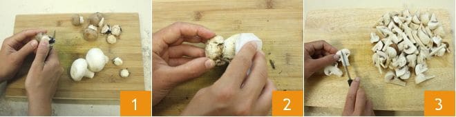 Um die herzhafte Polenta-Torte zuzubereiten, beginnen Sie mit den Zutaten für die Füllung. Zuerst kümmern Sie sich um die Reinigung der Pilze: Entfernen Sie die Erdreste von den Steinpilzen und den Champignons (1-2). Nach dem Reinigen und Waschen schneiden Sie die Pilze in Viertel 3 und legen sie in eine Schüssel.