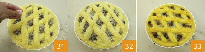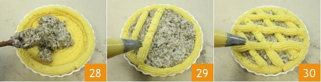 Geben Sie nun die Füllung in die Mitte 28 und glätten Sie sie mit der Rückseite eines Holzlöffels. Verwenden Sie wieder den Spritzbeutel, um die klassischen Rauten der Torte zu formen (29-30).