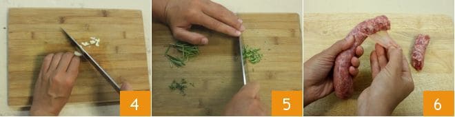 Nun schälen Sie eine Knoblauchzehe und hacken sie fein 4, dann strippen Sie die Rosmarin- und Thymianzweige und hacken die Nadeln und Blätter fein 5. Schließlich schneiden Sie die Wursthaut vorsichtig ein und krümeln die Wurst 6, entfernen die Haut und sammeln das Fleisch in einer Schüssel.
