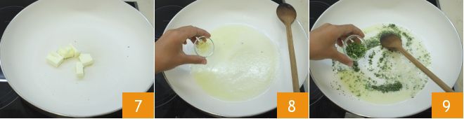 Zu diesem Zeitpunkt schmelzen Sie die Butter in einer großen Pfanne 7, fügen das gehackte Knoblauch 8 und das gehackte Rosmarin und Thymian 9 hinzu und lassen alles bei niedriger Hitze einige Minuten anbraten.