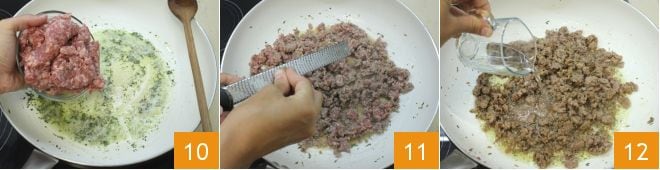 Geben Sie die Wurst in die Pfanne und lassen Sie sie 10 Minuten lang kochen 10. Während des Kochens würzen Sie alles, indem Sie Muskatnuss reiben 11, falls gewünscht, können Sie auch direkt das Pulver hinzufügen, und mit Weißwein ablöschen 12.