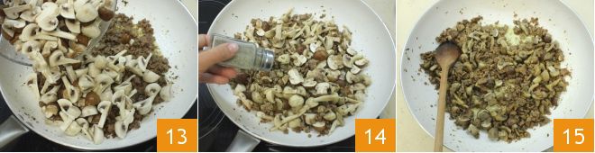 Nach dieser Zeit fügen Sie die geschnittenen Pilze hinzu, die Sie beiseitegelegt hatten 13, bewahren Sie einige für die endgültige Dekoration der Tarte auf, und würzen Sie nach Belieben mit Salz und Pfeffer 14, dann lassen Sie alles weitere 15 Minuten bei niedriger Hitze kochen, abgedeckt, bis sie leicht welk sind 15. Schalten Sie die Hitze aus und stellen Sie es beiseite.