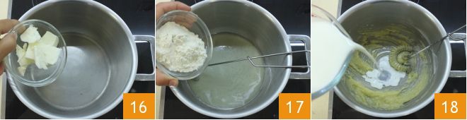 Bereiten Sie nun die Bechamel-Sauce vor: geben Sie die Butter in einen hohen Topf 16 und lassen Sie sie bei niedriger Hitze schmelzen. Sobald sie geschmolzen ist, fügen Sie das bereits gesiebte Mehl hinzu 17 und lassen Sie es einige Minuten kochen, während Sie ständig rühren, um zu verhindern, dass das Mehl am Boden klebt. Dann fügen Sie die zuvor erhitzte Milch hinzu 18 und rühren weiter.