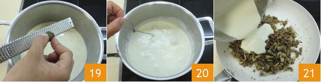 Würzen Sie mit einer Prise Salz und Pfeffer und einer Prise geriebener Muskatnuss 19 oder in Pulverform, dann decken Sie den Topf ab und lassen Sie es etwa 15 Minuten kochen, bis die Bechamel-Sauce angedickt ist 20. Um die Bechamel-Sauce optimal zuzubereiten und aufzubewahren, konsultieren Sie unser Rezept hier. Sobald sie fertig ist, geben Sie die Bechamel-Sauce in die Wurst- und Pilzfüllung 21 und mischen alles, um es zu integrieren.