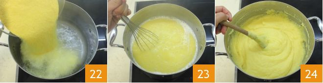 Kümmern Sie sich um die Polenta: füllen Sie einen großen Topf mit Wasser, salzen Sie es, geben Sie einen Schuss Öl hinzu und bringen Sie es zum Kochen. Dann streuen Sie die Polenta ein 22 und beginnen Sie kräftig mit einem Schneebesen zu rühren 23. Fahren Sie fort, mit einem Holzlöffel zu rühren, bis die Polenta eine dicke Konsistenz erreicht hat 24. Schalten Sie die Hitze aus und lassen Sie sie abkühlen. Um herauszufinden, wie Sie die Polenta optimal zubereiten und aufbewahren, konsultieren Sie das Rezept hier.