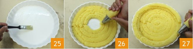 In der Zwischenzeit fetten Sie eine 27 cm Durchmesser Tortenform mit Butter ein, indem Sie einen Pinsel verwenden 25, dann geben Sie die Polenta in einen Spritzbeutel mit Sterntülle und erstellen Sie den Boden der Torte, indem Sie konzentrische Kreise formen 26. Schließlich gestalten Sie den Rand der Torte, indem Sie die Polenta entlang des Randes der Tortenform spritzen 27.