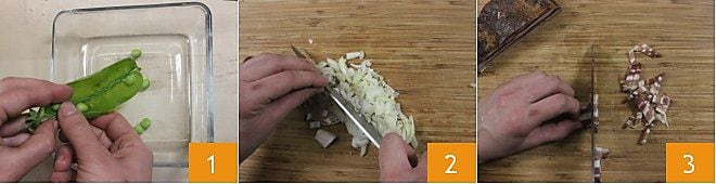 Um die herzhaften Scones mit Erbsen und Speck zuzubereiten, beginnen Sie damit, die frischen Erbsen zu säubern: Schälen Sie sie, indem Sie die Schoten öffnen und die Erbsen in einer Schüssel aufbewahren 1. Nehmen Sie eine halbe Zwiebel, schälen Sie sie, legen Sie sie auf ein Schneidebrett und hacken Sie sie fein 2, dann schneiden Sie den frischen Speck in Würfel 3, verwenden Sie den von Ihnen bevorzugten: mild oder geräuchert. Wenn Sie keinen frischen Speck verwenden möchten, können Sie auch die gewürfelten, im Supermarkt im Kühlregal erhältlichen Speckwürfel verwenden.