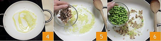 Nehmen Sie nun eine Antihaftpfanne, geben Sie etwas Öl hinein und braten Sie die gehackte Zwiebel an 4. Wenn die Zwiebel angebraten ist, fügen Sie die gewürfelten Speckstücke hinzu 5 und schließlich die geschälten frischen Erbsen 6. Lassen Sie alles bei niedriger Hitze für etwa 15-20 Minuten kochen und geben Sie, wenn nötig, etwas Wasser hinzu, um den Kochvorgang zu unterstützen. Einmal gekocht, lassen Sie es abkühlen.