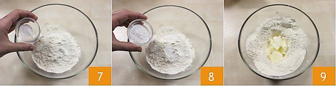 In der Zwischenzeit bereiten Sie den Teig für die Scones vor: Geben Sie das Mehl in eine große Schüssel und fügen Sie das Salz 7, die Hefe 8 und die in Stücke geschnittene Butter bei Raumtemperatur hinzu 9.