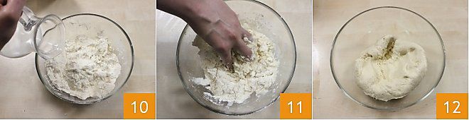 Vermischen Sie die Zutaten, fügen Sie die Milch hinzu 10 und kneten Sie mit den Händen 11, bis Sie eine ziemlich kompakte Masse erhalten 12.