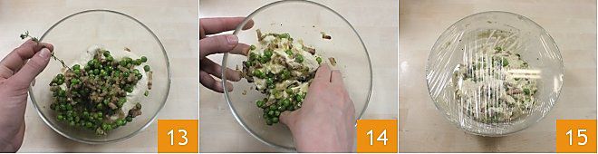 Nun fügen Sie die gekochten Erbsen und Speckwürfel sowie einige Thymianblätter hinzu 13. Arbeiten Sie weiter von Hand 14, bis der Teig homogen ist. Decken Sie die Schüssel mit Frischhaltefolie ab 15 und lassen Sie ihn für mindestens eine halbe Stunde im Kühlschrank abkühlen und aufgehen.