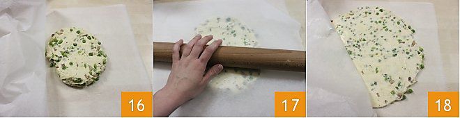 Breiten Sie ein Stück Backpapier auf einer Arbeitsfläche aus und legen Sie den festen und aufgegangenen Teig darauf 16. Decken Sie den Teig mit einem weiteren Stück Backpapier ab und rollen Sie die Masse mit einem Nudelholz 17 zu einem etwa 1,5 cm dicken Teigfladen 18.