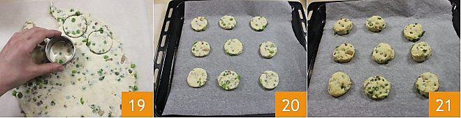 Stechen Sie dann Kreise aus dem ausgerollten Teig mit einem Ausstecher mit einem Durchmesser von 6,5 cm aus 19. Legen Sie die Teigkreise auf ein mit Backpapier ausgelegtes Backblech 20 und backen Sie sie im bereits vorgeheizten statischen Ofen bei 200 Grad für 15 Minuten (wenn Sie einen Umluftofen verwenden, backen Sie bei 180 Grad für etwa 10 Minuten). Wenn die Scones leicht goldbraun an der Oberfläche sind, sind sie gar 21. Nehmen Sie sie aus dem Ofen und lassen Sie sie auf einem Gitter abkühlen.