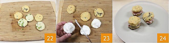 Wenn sie abgekühlt sind, legen Sie sie auf ein Schneidebrett oder eine Ablage und halbieren Sie sie 22. Bestreichen Sie sie mit Frischkäse oder Mascarpone 23 und füllen Sie sie mit dünn geschnittenem gekochten Schinken (oder Speck). Nun sind Ihre herzhaften Scones mit Erbsen und Speck bereit, auf einer Servierplatte serviert und mit ihrer köstlichen Füllung genossen zu werden 24!