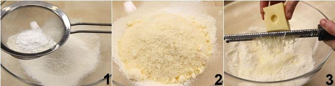 Um den herzhaften Plumcake vorzubereiten, beginnen Sie damit, das Mehl und das Backpulver in einer Schüssel zu sieben 1, fügen Sie dann den fein geriebenen Grana Padano hinzu 2. Vermengen Sie die Zutaten gut und fügen Sie den geriebenen Leerdammer hinzu 3