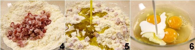 und die gewürfelten geräucherten Speckwürfel 4, vermischen Sie alles. Geben Sie dann das Olivenöl extra vergine nach und nach hinzu 5. In einer anderen Schüssel schlagen Sie die Eier mit der Sahne und der Milch 6,