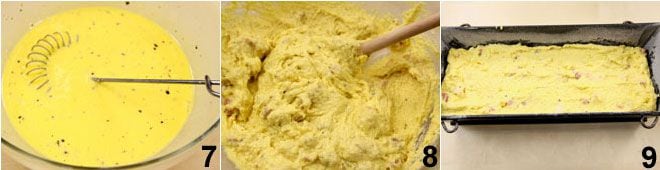 salzen und pfeffern Sie 7 und fügen Sie die so erhaltene Flüssigkeit zur Mehl-, Käse- und Speckmischung hinzu. Rühren Sie mit einem Holzlöffel, bis die Zutaten gut vermischt sind 8. Fetten und bemehlen Sie eine Plumcake-Form mit einem Liter Fassungsvermögen und geben Sie den Teig hinein. Glätten Sie ihn mit der Rückseite eines Löffels 9 und backen Sie ihn im vorgeheizten Ofen bei 180°C für 45/50 Minuten, machen Sie die Stäbchenprobe, um die Garstufe zu überprüfen. Wenn der herzhafte Plumcake fertig ist, warten Sie, bis er lauwarm ist, bevor Sie ihn aus der Form nehmen, lassen Sie ihn dann vollständig auf einem Rost abkühlen. Servieren Sie Ihren herzhaften Plumcake in Scheiben!