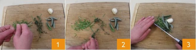 Um das Huhn mit Kartoffeln, Pilzen und kleinen Zwiebeln zuzubereiten, setzen Sie zunächst einen Topf mit Salzwasser auf, den Sie für die Gemüsebrühe benötigen. Zupfen Sie den Rosmarin 1 und den Thymian 2, fügen Sie den Salbei und den Knoblauch hinzu und hacken Sie alle Aromen fein 3 und geben Sie sie in eine Schüssel;
