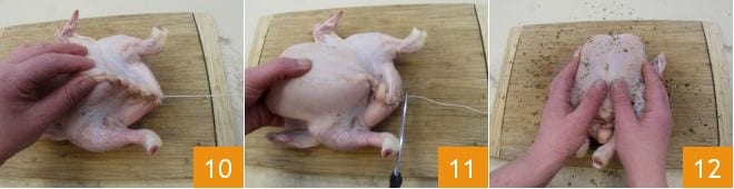 Schließen Sie das Huhn mit einer Küchennadel und Garn 11. Nachdem Sie diesen Vorgang abgeschlossen haben, schneiden Sie den überschüssigen Faden ab 12, dann bestreuen Sie das Äußere des Huhns mit den Aromen, die Sie beiseitegelegt haben 13.
