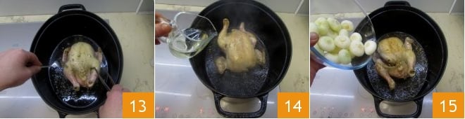 Stellen Sie einen Topf mit dickem Boden mit einem Schuss Öl auf den Herd. Legen Sie das Huhn hinein 13, drehen Sie es mit Hilfe einer Küchenzange, um eine gleichmäßige Bräunung zu erzielen, und löschen Sie dann mit Weißwein ab 14. Geben Sie die geschälten kleinen Zwiebeln hinzu 16,