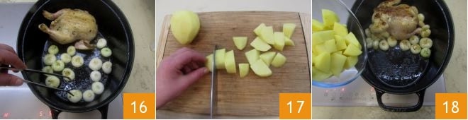 und verteilen Sie sie nebeneinander, indem Sie sie von beiden Seiten drehen, um eine gleichmäßige Garung zu gewährleisten 16, bis sie gut gebräunt sind: das dauert etwa 6-7 Minuten. Schneiden Sie inzwischen die Kartoffeln in ziemlich große Würfel 17. Verschieben Sie die Zwiebeln leicht und geben Sie die geschnittenen Kartoffeln in den Topf, lassen Sie sie einige Minuten anbraten 18.