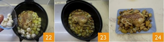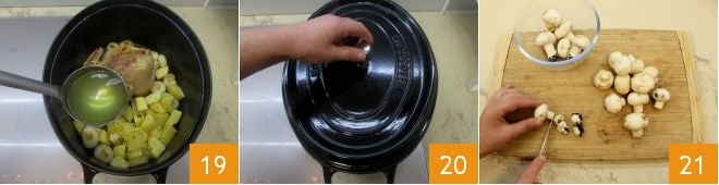 Nach der erforderlichen Zeit geben Sie die gereinigten, ganzen Pilze hinzu 22 und lassen Sie sie 10 Minuten lang weiterkochen, immer mit dem Deckel bedeckt. Entfernen Sie ihn anschließend und kochen Sie weitere 5 Minuten: Schalten Sie die Hitze aus 23 und Ihr Huhn mit Kartoffeln, Pilzen und kleinen Zwiebeln ist bereit, serviert zu werden 24.
