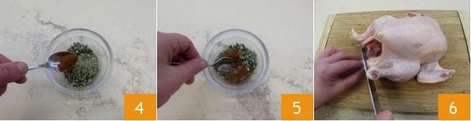 Fügen Sie die Paprika hinzu (ein halber Teelöffel reicht) 4, mischen Sie mit einem Teelöffel und stellen Sie sie beiseite 5. Flämmen Sie das Huhn, um eventuelle Federreste zu entfernen, spülen Sie es unter reichlich fließendem Wasser ab und trocknen Sie es ab, dann entfernen Sie mit einem Messer den Schwanz 6.