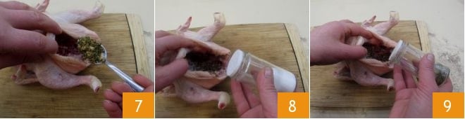 Nehmen Sie die gehackten Aromen und füllen Sie einen Löffel nach dem anderen in das Innere des Huhns 7 (einen kleinen Teil bewahren Sie auf, den Sie später benötigen), würzen Sie mit Salz und Pfeffer (8-9).