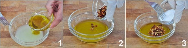 In einer Schüssel den Zitronensaft mit dem Öl 1 und den Chiliflocken 2 sowie dem Salz 3 vermischen.