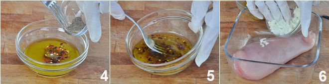 Dann den gemahlenen schwarzen Pfeffer 4 hinzufügen und gut vermischen. Die Hähnchenbrust der Länge nach aufschneiden, um 4 Scheiben zu erhalten, und sie in eine Schüssel geben, in die auch die gehackte Zwiebel (6-7) hinzugefügt wird.