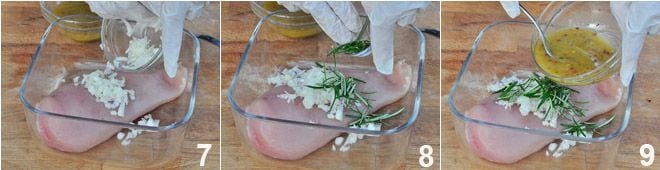 und den Rosmarin 8, dann etwa die Hälfte der zuvor vorbereiteten Marinade darüber gießen 9.