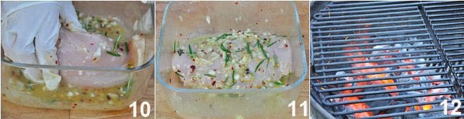 Die Hähnchenscheiben gut in der Schüssel wenden, damit sie die Marinade gut aufnehmen 10, und für eine Stunde stehen lassen 11. Dann den Grill vorheizen 12 und einen zuvor mit Alufolie bedeckten Ziegel auf das Gitter legen.