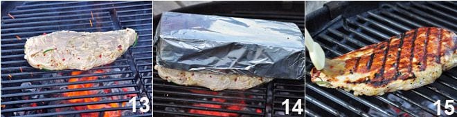 Nachdem die Zeit verstrichen ist, die Marinade von der Hähnchenbrust abtupfen und auf den Grill legen 13 und das Gewicht darauflegen 14. Die Flamme unter dem Hähnchen reduzieren und etwa 5 Minuten kochen lassen. Den Ziegelstein entfernen, das Hähnchen um 90° drehen, den Ziegelstein wieder auflegen und weitere 5 Minuten kochen lassen. Den Ziegel erneut entfernen, die restliche Marinade aufpinseln 15, das Hähnchen wenden und den Ziegel wieder auflegen. Auf die gleiche Weise wie die vorherige Seite garen. Nach dem Kochen das Gericht mit einem Rosmarinzweig dekorieren.