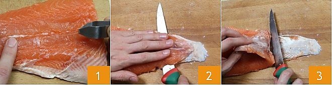 Um den im Ofen marinierten Lachs zuzubereiten, beginnen Sie damit, das Lachsfilet zu säubern (falls Sie einen ganzen Lachs gekauft haben, müssen Sie die Innereien entfernen und ihn filetieren). Entfernen Sie mit einer Küchenpinzette die Gräten 1, dann ziehen Sie die Haut vorsichtig mit einem scharfen Messer ab, beginnend am Schwanz (2-3), um die Haut vom Filet zu trennen.