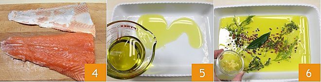 Einmal gereinigt, sollten Sie etwa 800 g Lachsfilet erhalten 4. An diesem Punkt können Sie mit der Marinade beginnen: Gießen Sie das Öl in eine hochrandige Keramik- oder Glasauflaufform 5. Fügen Sie alle Aromen hinzu: den Zitronensaft und die geriebene Schale 6,
