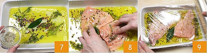 schwarzer Pfeffer, rosa Pfeffer, Salz, Dill, Thymian, Lorbeerblatt, Anis- und Fenchelsamen 7. Geben Sie die Lachsfilets hinzu und massieren Sie sie sanft, damit der Geschmack der Marinade in das Fleisch eindringen kann. Decken Sie die Auflaufform mit Frischhaltefolie ab und lassen Sie den Lachs 24 Stunden im Kühlschrank marinieren.