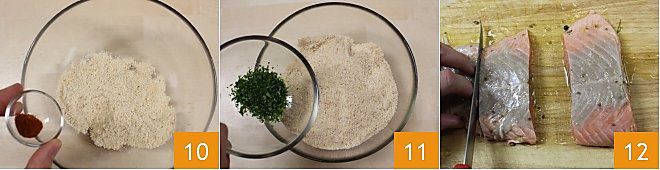 Bereiten Sie in der Zwischenzeit die Panade vor, indem Sie das Paniermehl mit dem Mandelmehl mischen, dann den milden Paprika 10, die Petersilie hinzufügen und schließlich salzen und pfeffern. Nach dem Marinieren nehmen Sie den Lachs mindestens eine Stunde vor dem Backen aus dem Kühlschrank, damit er Zimmertemperatur erreicht. Legen Sie ihn auf ein Schneidebrett, schneiden Sie 4 gleichgroße Stücke 12, um eine gleichmäßige Garung im Ofen zu gewährleisten,