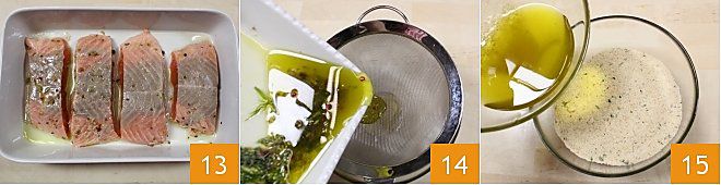 legen Sie sie in die Auflaufform und salzen Sie 13. Filtern Sie das Marinadenöl mit einem Sieb 14. Fügen Sie das gefilterte Öl zur Panade hinzu 15